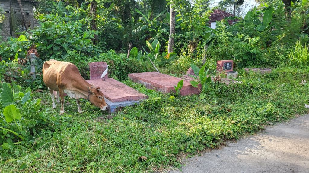 Ein kleiner Friedhof mit Kuh und Vogel auf einem Grab