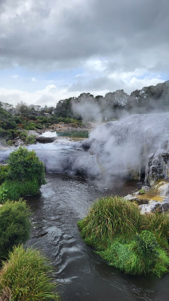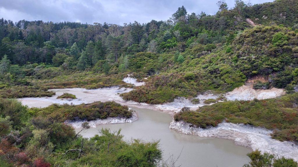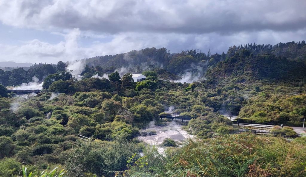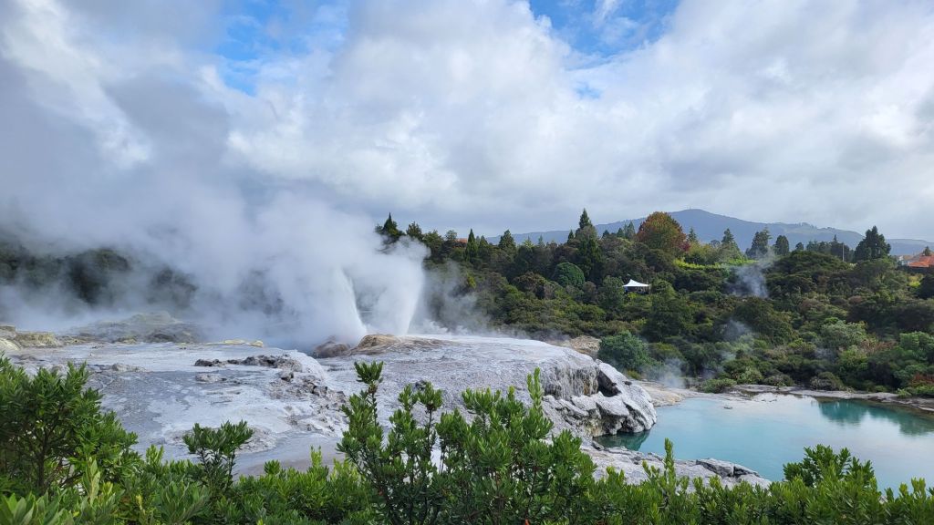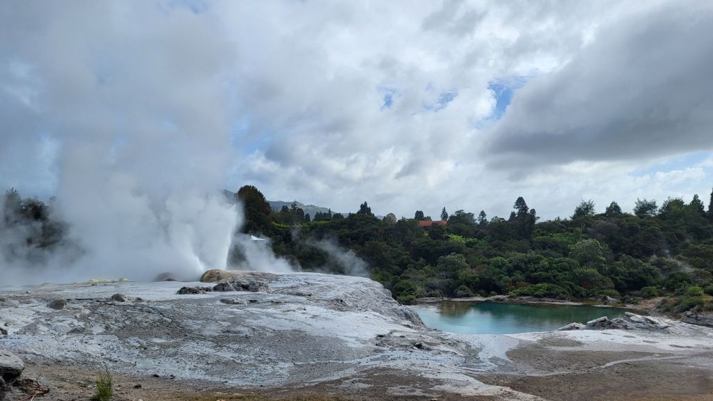 Daneben befindet sich hier das Whakarewarewa – Geothermal Valley, ein geothermisches Tal in der Nähe eines Gebiets mit noch aktiven Vulkanen. Hier spritzt, dampft und und blubbert es nur so aus dem Boden, Geysiren und Schlammpools.