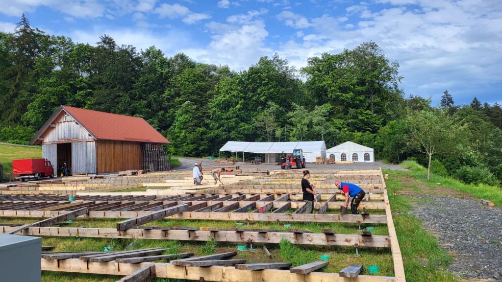 Seit eineinhalb Wochen ist unser Team jetzt damit beschäftigt den Küchenboden, mit allem was dazu gehört, auf dem Sommerkursgelände auszulegen.