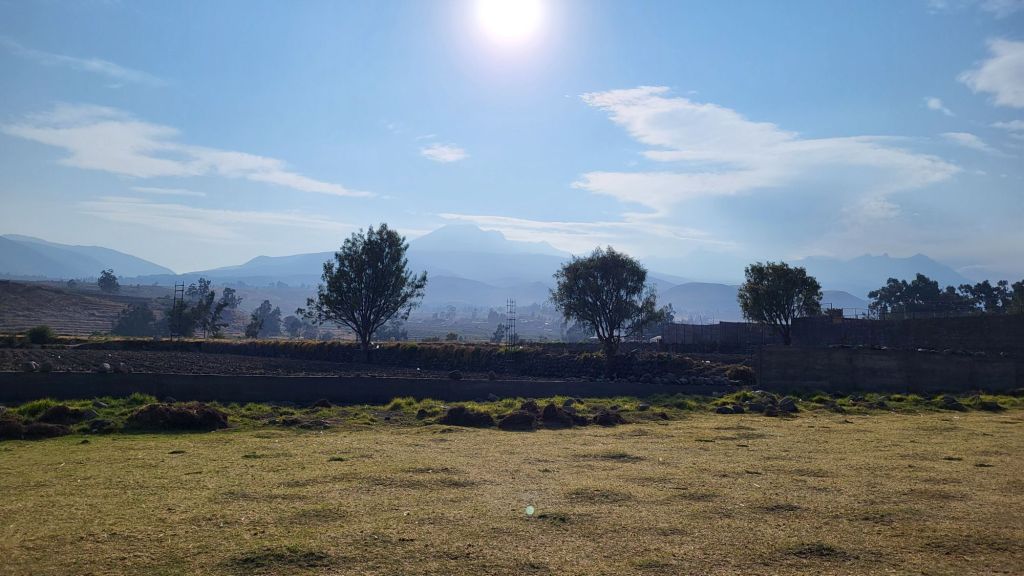 Der noch aktive Vulkan „Misti‘ ist 5 822 m hoch, zuletzt 1784 ausgebrochen und das Wahrzeichen von Arequipa.links hinten im Dunst sieht man Chachani, den höchsten der drei Vulkane mit 6 057 mZwischen den Bäumen ist Picchu Picchu der niedrigste mit 5 665 mgelegentlich sieht man Rauch sog. Fumarolen über dem Misti aufsteigen…