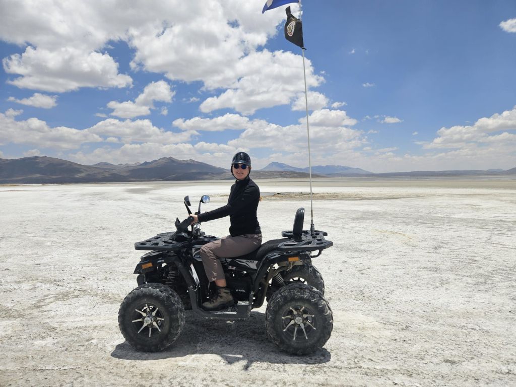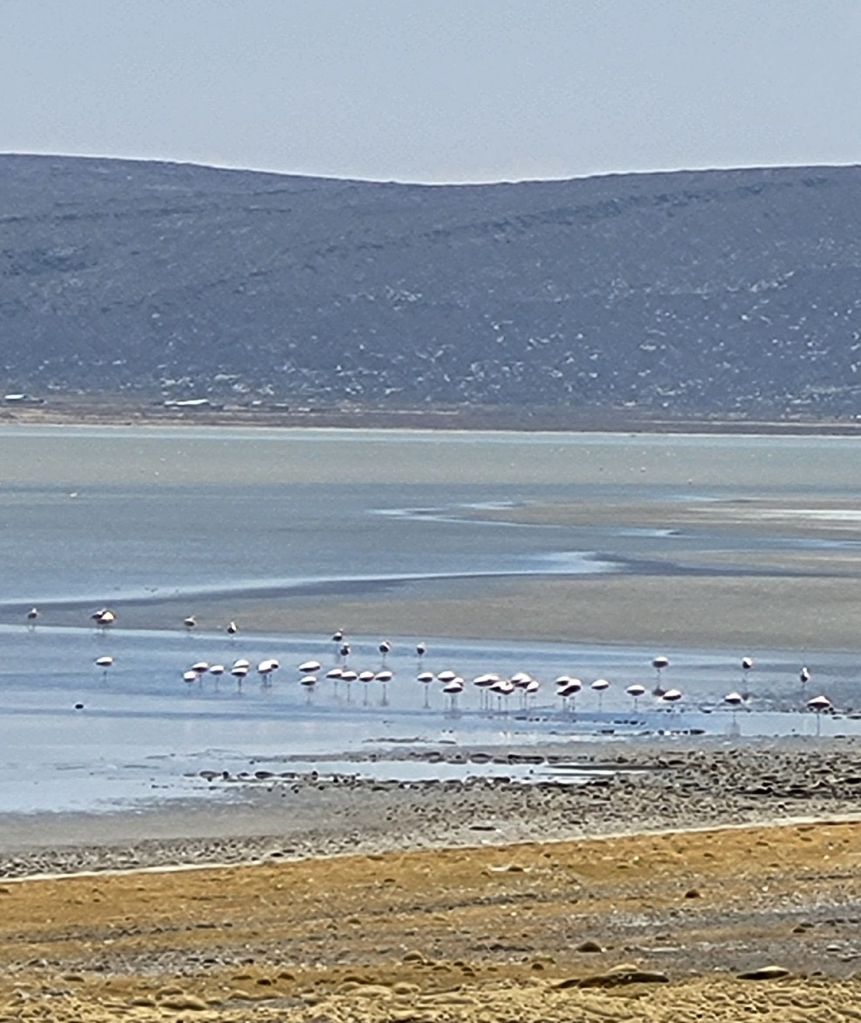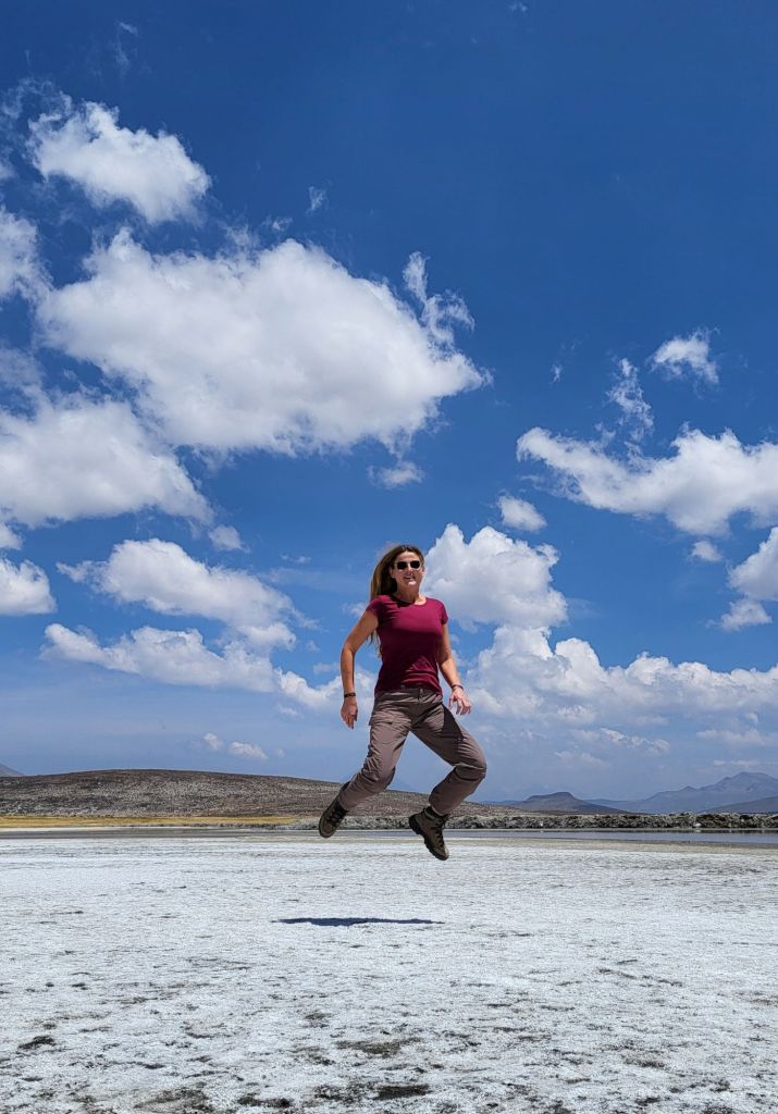 Flamingos in der Ferne 🦩🦩🦩Pichu Pichu von der anderen Seite… und Chachani mit Lamas davor. Alle drei Vulkane können ganzjährig bestiegen werden.Aktuell ist der Salzsee ausgetrocknet und man kann lustige Bilder auf ihm machen.… oder mit einem Quadt darauf herumfahren