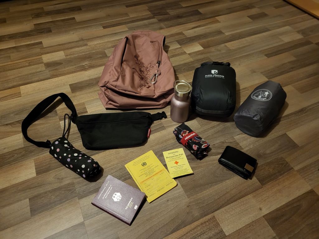Zusätzlicher kleiner Rucksack und Bauchgurt gefüllt mit einer Isomatte, kl. Daunenschlafsack, Regenschirm, kleine faltbare Tasche, Geldbeutel, und Dokumenten