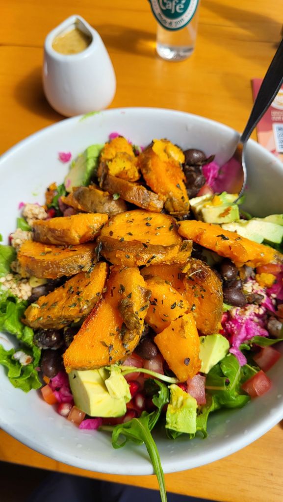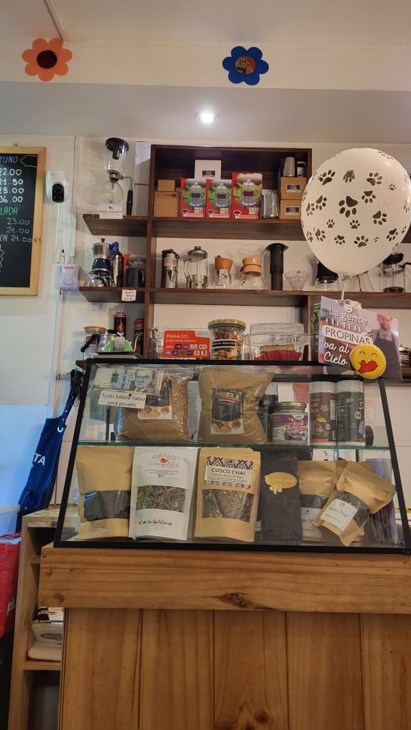 Vegane Pizza 😋Es gibt hier viele kleine, einladende Cafésperuanische Markthalle…getrocknete Coca- und Steviablätter… mit Angabe der Wirkung und Zubereitungsanleitung
