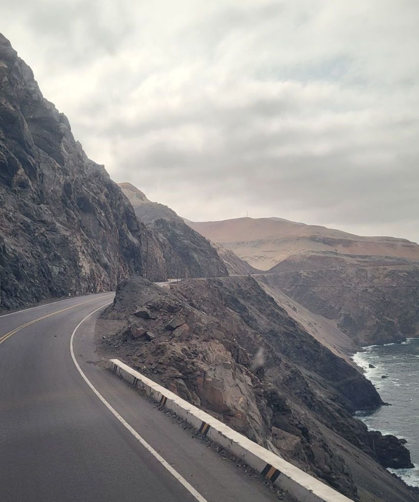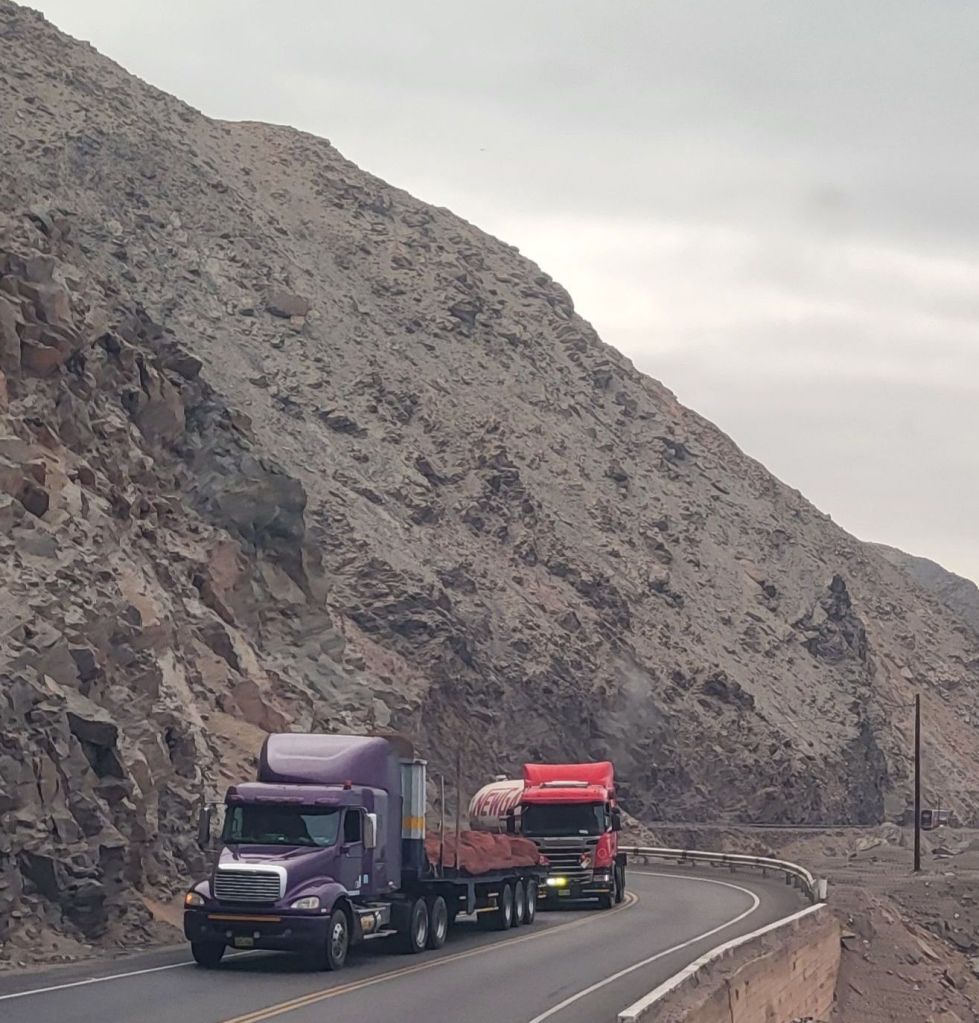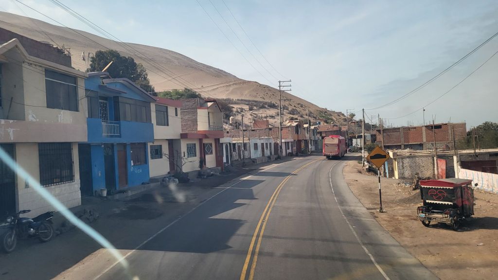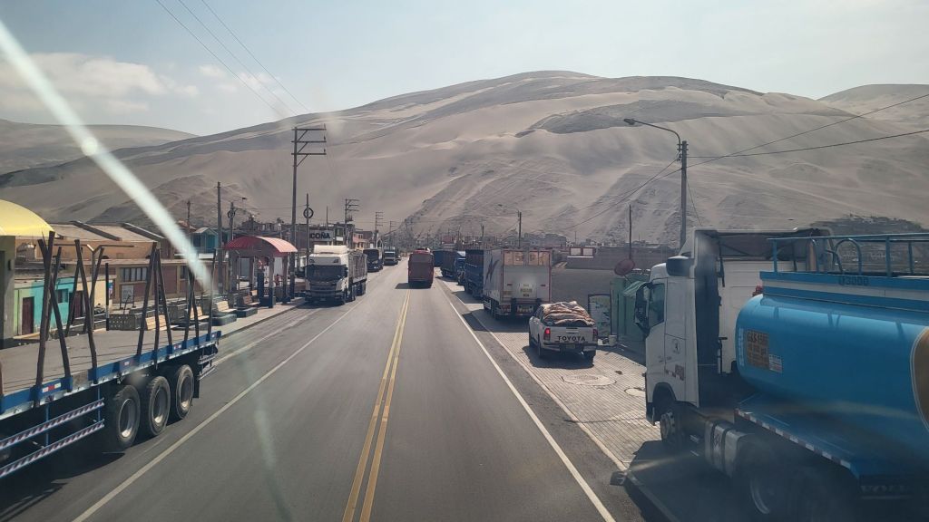 Bei der Abfahrt in Lima war es stockdunkel. Nach Sonnenaufgang glich die Landschaft einer Felsenwüstegelegentlich kamen wir durch kleine Ortschaften… und begegneten vielen Trucks…dichter Verkehr kurz vor Arequipa