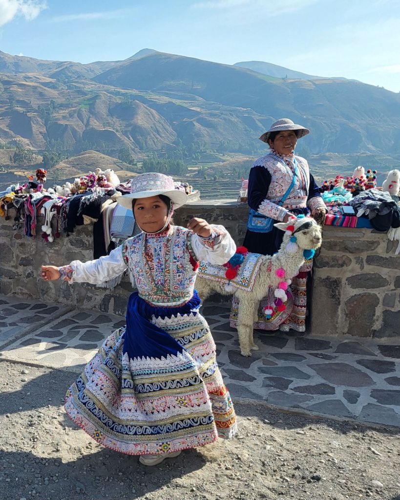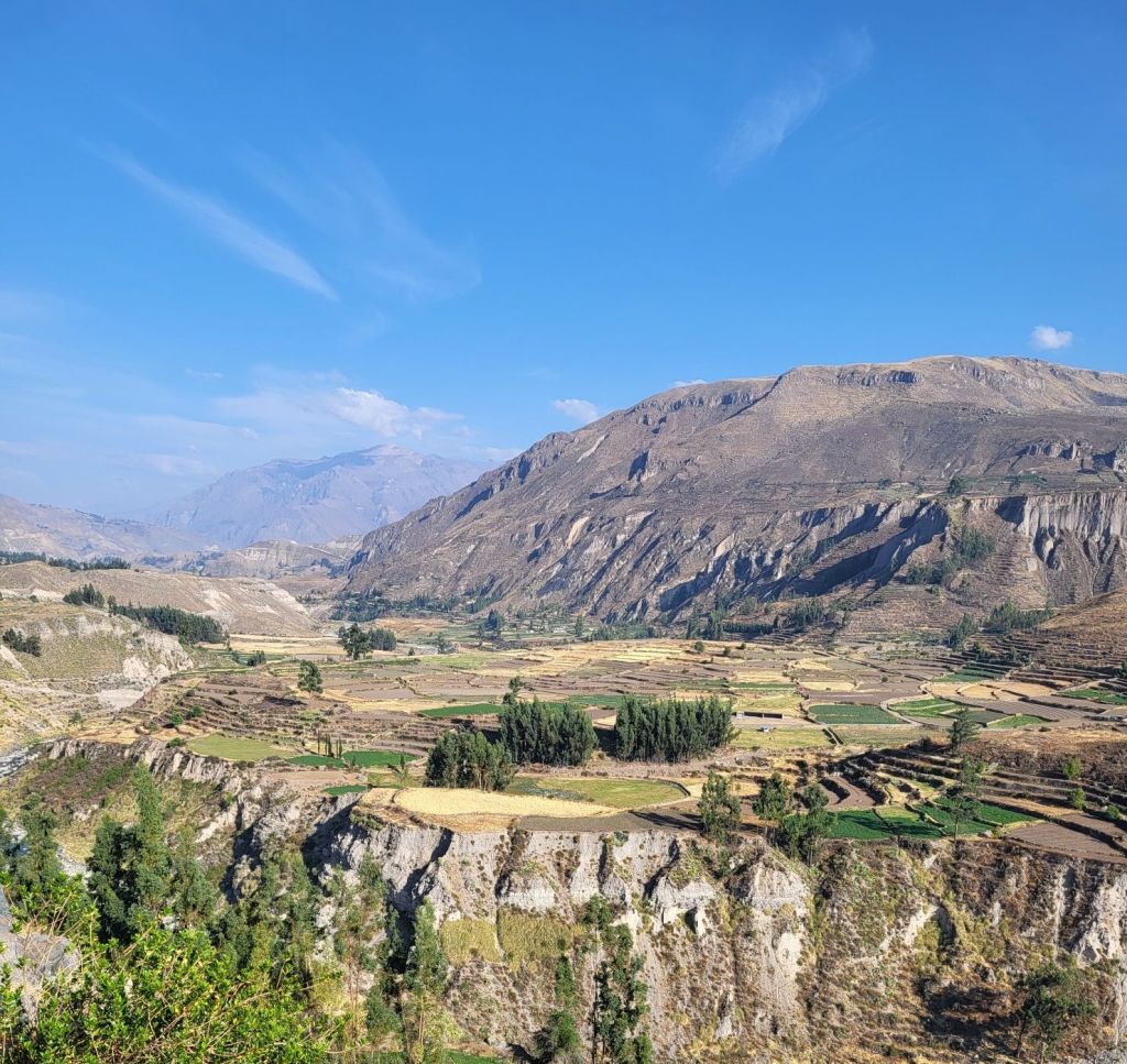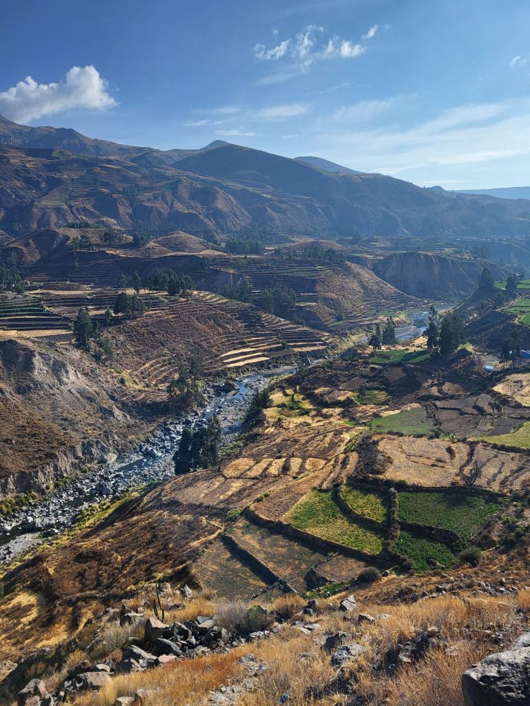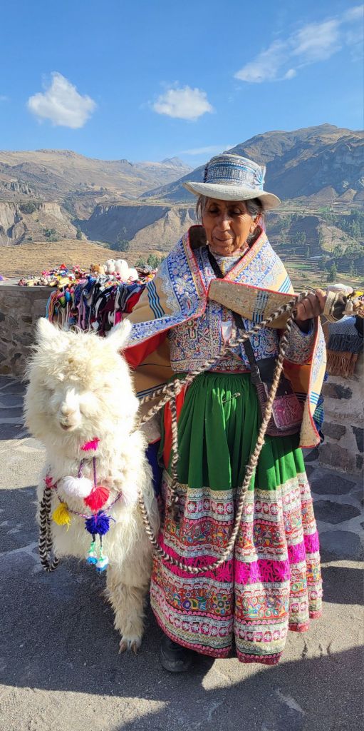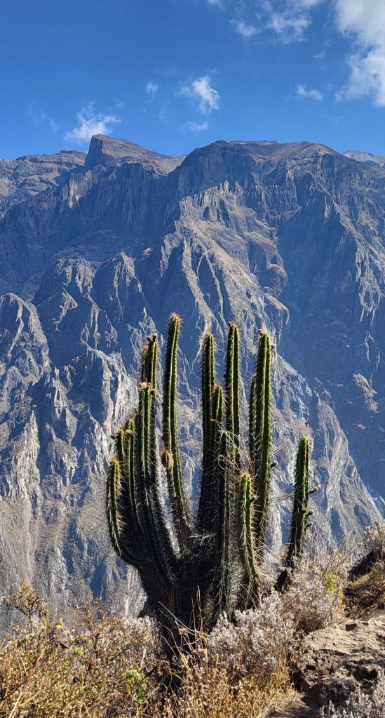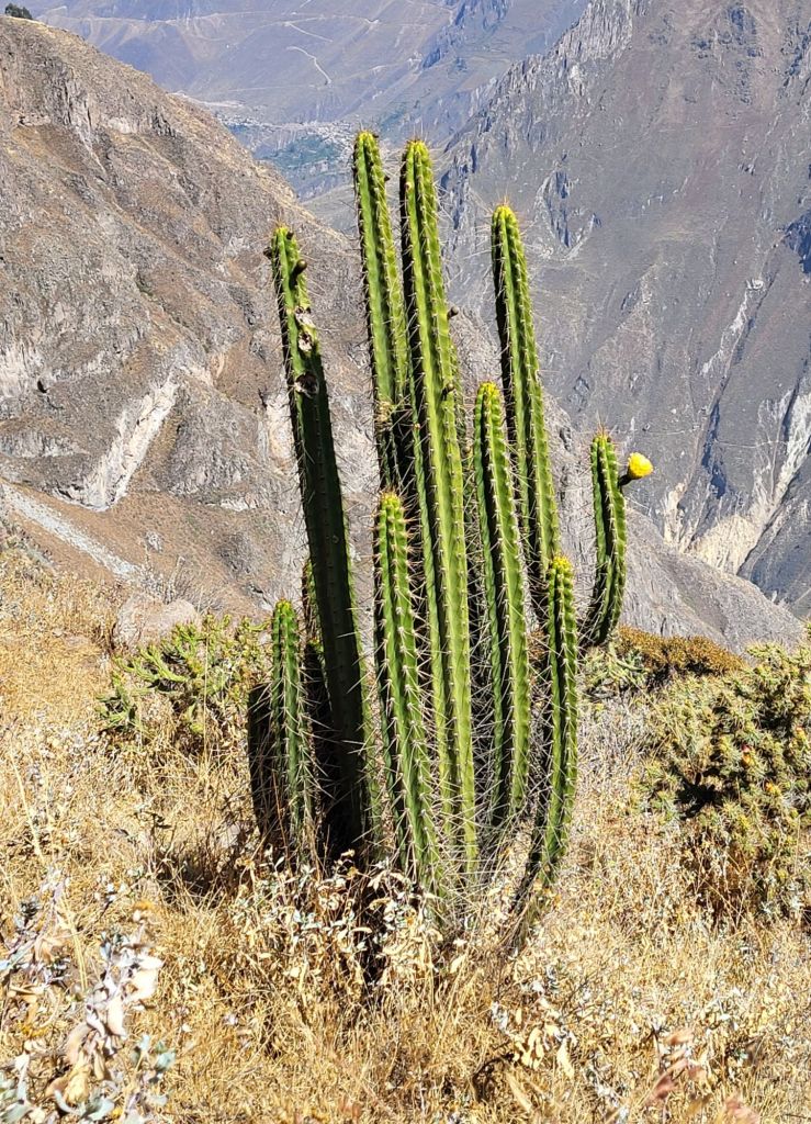 Das Colca ValleyTerrassen aus der InkazeitAn den Busstops findet man Frauen und Kinder in traditioneller Kleidung, die sich durch Verkauf, Tanzen oder Fotografieren mit einem Lama ein paar Soles verdienen…Kirche in Chivay im Colca TalSaft aus der Kaktusfrucht „Sanky“; schmeckt ein bisschen wie Kiwi.… und ist sehr gesund.Es gibt hier sehr viele mannsgroße KakteenAuf dem halbstündigen Wanderweg zum Hauptaussichtspunkt……Blick hinunter in den CanyonIm Colca Canyon ist auch der Andencondor zuhause, der schwerste Greifvogel der Erde. (Bild aus dem Internet, da er zu schnell ist, um ihn selber fotografieren zu können.)