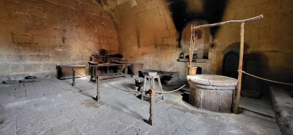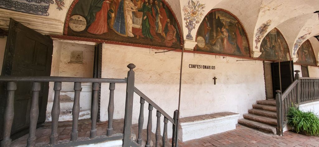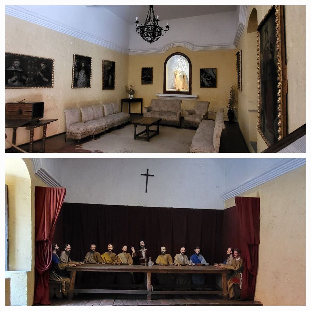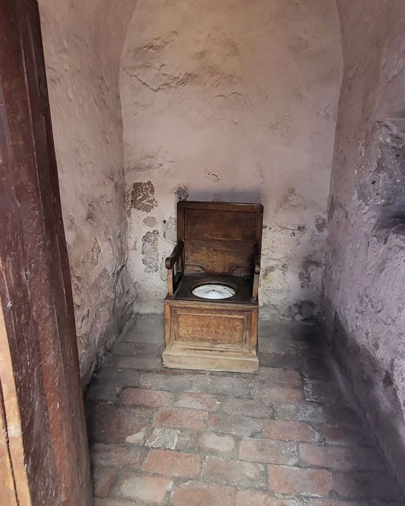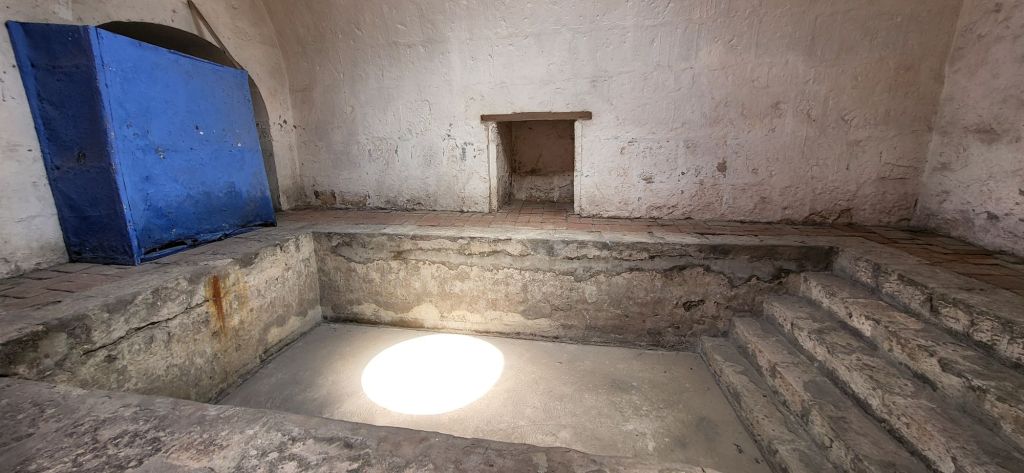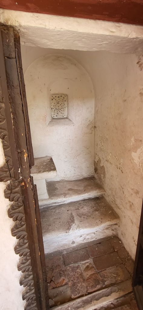 Der Besuchsbereich mit Trenngitter ähnelt dem eines Gefängnisses. Ein direkter Kontakt sollte verhindert werden.Empfangszimmer für hochrangige Besucher, mit Blick auf ein geschnitztes „Letztes Abendmahl“ auf der gegenüberliegenden Raumseite Es gibt viele große Höfe…… und Gassen, die alle einen Namen haben.Anstatt kleinen Klosterzellen, hatte jede der 450 hier lebenden Nonnen ein kleines „Apartment“. Jedes hatte einen Schlafplatz, eine Küche, einen Essplatz und einen kleinen Innenhof. Keines glich dem anderen und hatte eine einfache bis gehobene Ausstattung. Gezahlt wurde das alles von der Mitgift der Angehörigen.WaschplatzGroße Küche mit Brunnen, wo auch gebacken wurde.Bad; es konnten zwei Nonnen mit Badekleidung und einem Vorhang in der Mitte gleichzeitig baden.KlosterkircheBeichtstühle, die von der Straße aus zugänglich waren; auf der Innenseite befindet sich die Kirche.Beichte to Go 🤣In einem Apartment mit gehobenem Interieur, habe ich dann doch noch eine Toilette entdeckt…
