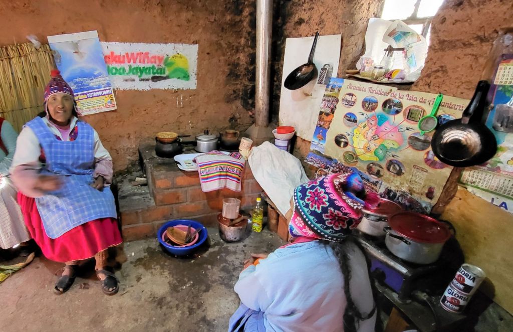Innenansicht; es gibt hier kein fließend Wasser, nur einen großen Wassertank. Und keine Heizung, nur dicke Decken.gemeinsames EssenKücheTracht der Frauen auf Amantani, die sie immer tragen. Die älteren Frauen stricken auch während des Gehens, s. l. Frau. Die Mützen, Pullover, Schals und Handschuhe werden dann verkauft.Pacha TataTempeltor zum Sonnenuntergang……fast wieder unten